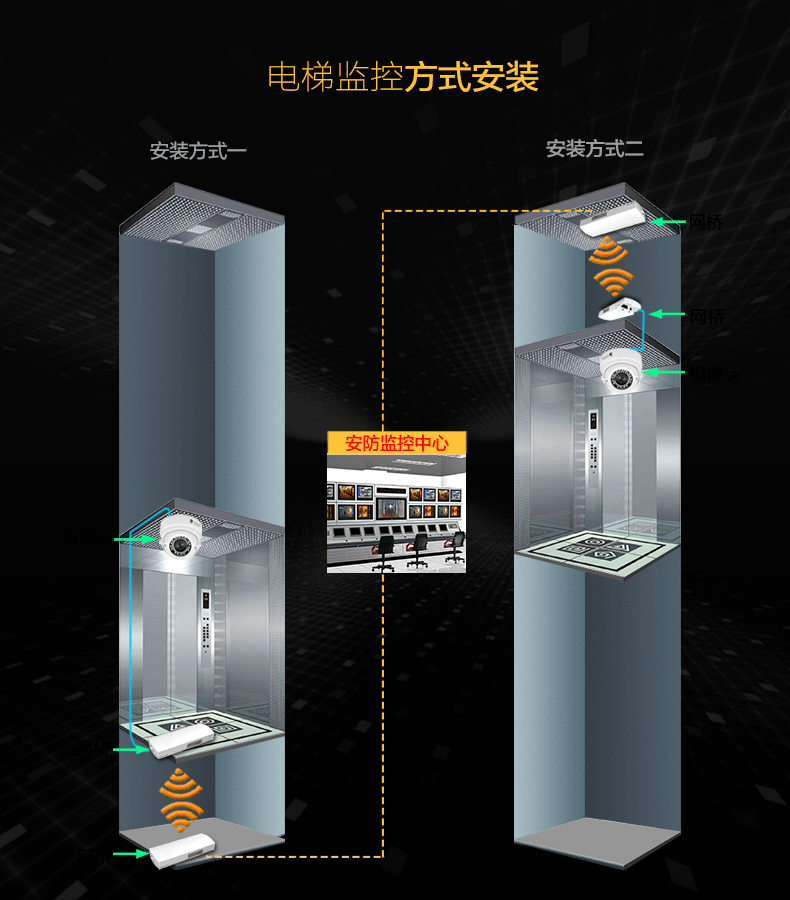 電梯內(nèi)底部已全部封閉,無法使用就近光纖節(jié)點對電梯視頻數(shù)據(jù)做傳輸,而電梯頂部留有電梯線纜口。這種情況下利用電梯轎廂與頂部的空隙空間,在電梯轎廂頂部安裝1臺專用無線網(wǎng)橋與電梯線纜口安裝的1臺電梯專用無線網(wǎng)橋進行數(shù)據(jù)傳輸,通過網(wǎng)線使用交換機把各電梯的視頻數(shù)據(jù)集中,最后通過豎井使用網(wǎng)線或者在樓層頂!使用一對電梯專用網(wǎng)橋,把集中的視頻數(shù)據(jù)傳回機房,通過硬盤錄像機在大屏上顯示,整套方案,安裝簡單,施工工期短,便于后期問題的排查,維護。